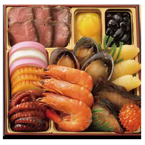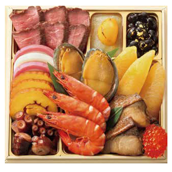 | 内容 | 26品目 【卵・乳成分・小麦・えび】 お重素材:紙 お重一段内寸サイズ:18.4×18.4×4cm 【金の重】 十勝ハーブ牛ローストビーフ、紅はるかきんとん、焼栗ブランデー風味、丹波種黒豆煮(金粉)、紅かまぼこ(グチ入り)、白かまぼこ(グチ入り)、上伊達巻、真たこ旨煮、あわび旨煮、国産味付数の子、車海老艶蒸、ぶり照焼、いくら醤油漬 【銀の重】 ローストビーフ、きんとん、栗甘露煮、北海道産黒豆煮、紅かまぼこ、白かまぼこ、伊達巻、たこ照焼、とこぶし旨煮、味付数の子、祝い海老、ぶり照焼、鱒いくら醤油漬 解凍方法:冷蔵庫内で段ごとに広げ24時間を目安、解凍後はお早めにお召しあがりください。 |