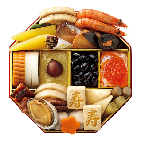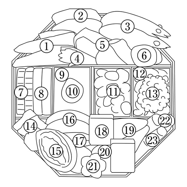 (1)味付数の子 (2)うまみ和豚豚角煮 (3)車海老艶煮 (4)田作り (5)ぶり照焼(6)鮭昆布巻 (7)伊達巻 (8)白かまぼこ (9)芋きんとん (10)渋皮栗甘露煮(11)丹波黒黒豆煮 (12)紅白なます (13)いくら醤油漬 (14)鱈旨煮 (15)あわび旨煮(16)れんこん煮 (17)椎茸煮 (18)寿高野煮 (19)筍旨煮 (20)里芋煮(21)梅花人参煮 (22)ごぼう煮 (23)ふき煮