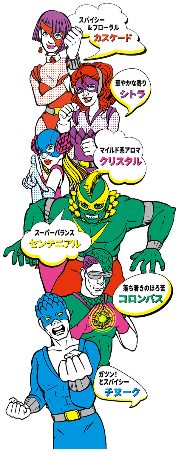 6種類のホップを6人の戦士に擬人化し、アメリカンコミック調に仕上げた、コミカルでインパクトのあるデザイン。6人の戦士のキャッチフレーズは、6種類のアメリカンホップの特徴と名称をそのまま表現しています。
