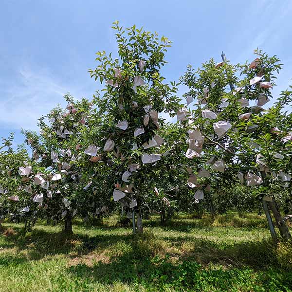 完熟のりんご生産を目指しているため、果実表面に蜜が浮き出ることがありますが、品質には何ら問題がありません。