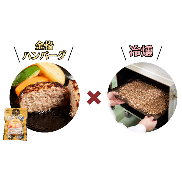 冷凍のまま燻製する“冷燻”製法で、お肉に香りをまとわせたハンバーグです。厳選した国産牛と白金豚のブレンドによる豊かなコクに、燻製の香ばしさが重なり合い、ひと口ごとに広がる薫り高い味わいをお愉しみいただけます。