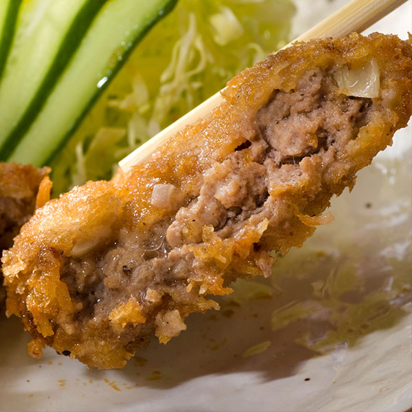 格之進の肉職人が厳選した上質な黒毛和牛と、岩手県花巻市が誇るブランド豚「白金豚」を、衣で一つ一つ丁寧に包み上げた合挽きメンチカツです。