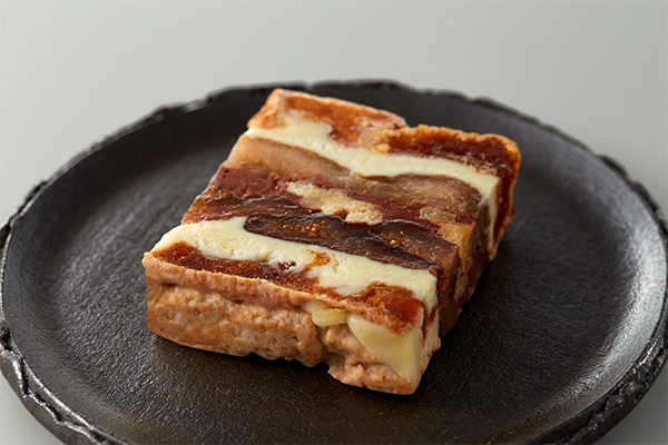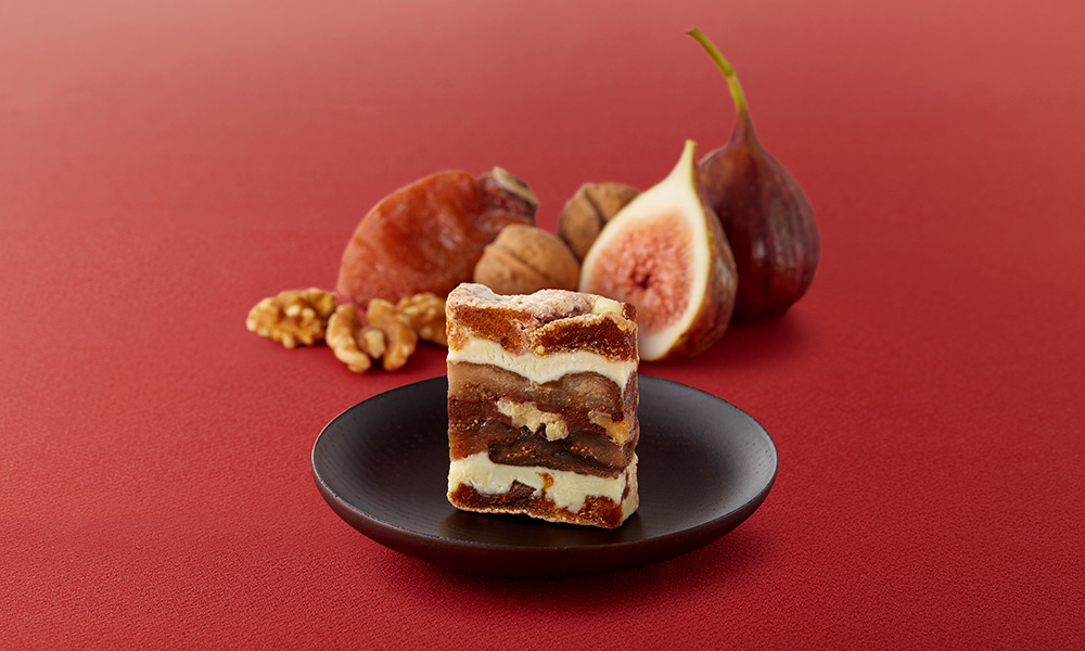 国産無花果の心地よいつぶつぶ感、干柿のねっとりとした自然な甘さ、胡桃のカリっとした食感、そして甘さを控えたホワイトチョコレートとビターチョコレートの5素材で構成しています。