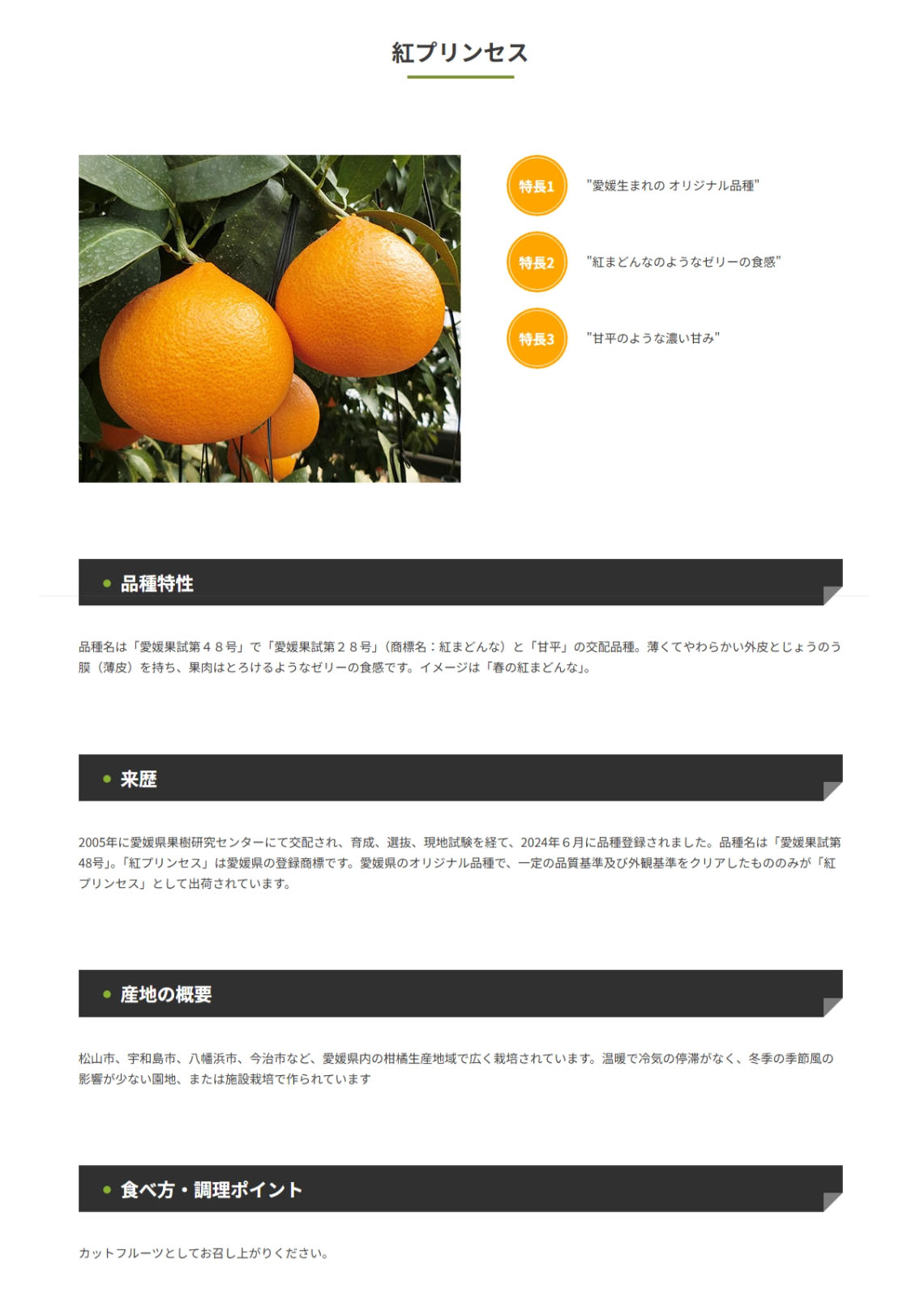 愛媛県の誇る愛媛果試第48号・紅まどんなと甘平に続く高級品種を目指して、その2品種を交配して育成された愛媛県オリジナル品種です。