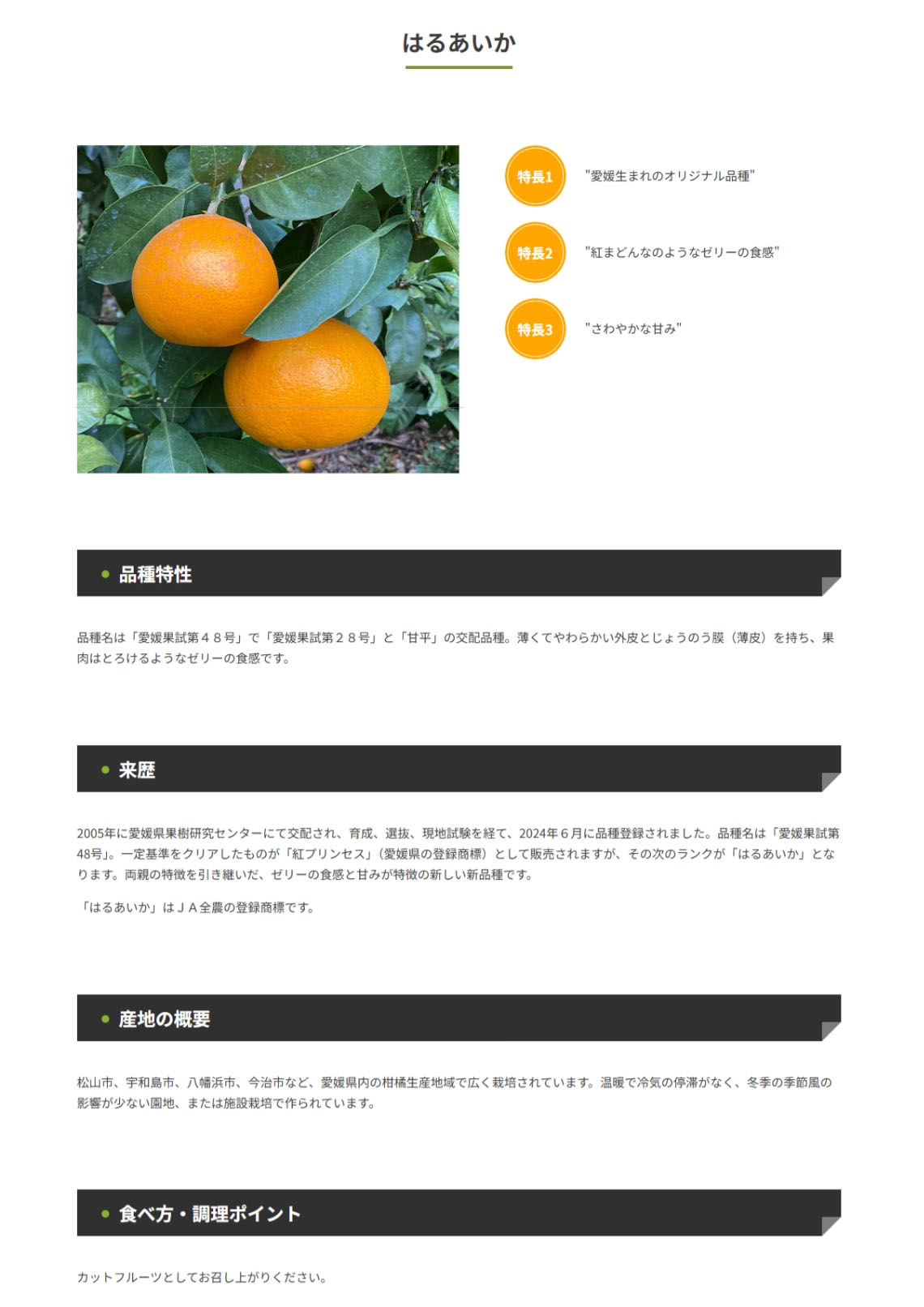 愛媛県の誇る愛媛果試第48号・紅まどんなと甘平に続く高級品種を目指して、その2品種を交配して育成された愛媛県オリジナル品種です。